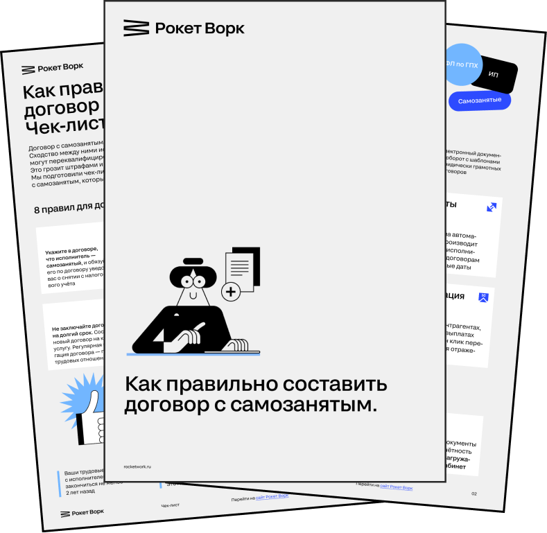 Рокет Ворк — платформа для работы с внештатными исполнителями: самозанятыми, ИП и физлицами по договору ГПХ. В личном кабинете можно находить специалистов под конкретные задачи, заключать электронные договоры, проводить выплаты и получать закрывающие документы